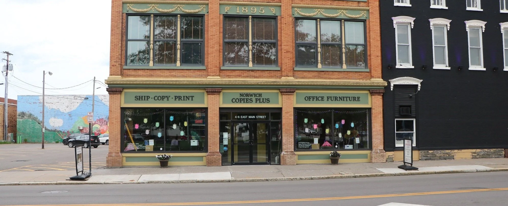 Since the 1950s, 6 East Main Street has served the Norwich community by providing retail merchandise and services to local businesses, government agencies, and community members. Starting as Sumner’s Business Supplies & Equipment, the store rebranded to Hayes Office Products from 1988 to 2013. Hummel’s Office Equipment, from Mohawk, NY, expanded their footprint into Norwich from 2013 to 2019. In 2013, the company reestablished as Norwich Copies Plus under ownership of Chris and Missy Hayes and Christine Walker. In 2025, Ryan and Paula Zieno purchased Norwich Copies Plus to ensure the business remained locally owned and operated and community focused.